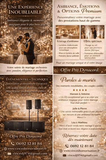 Chaque prestation est préparée sur mesure, avec sérieux, écoute et exigence, afin de garantir une ambiance à la hauteur de vos attentes.