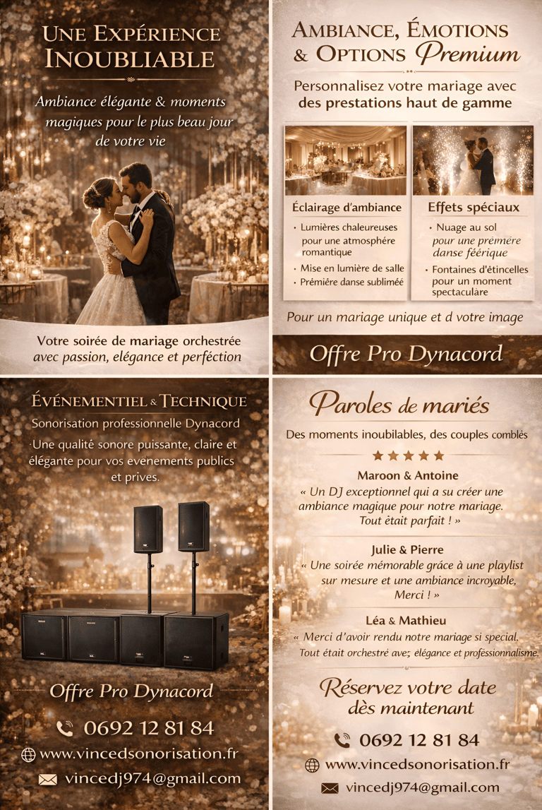 Spécialisé dans les mariages et soirées privées, je propose également la location de matériel de son et d’éclairage pour les professionnels, associations et événements d’entreprise à l’île de la Réunion.